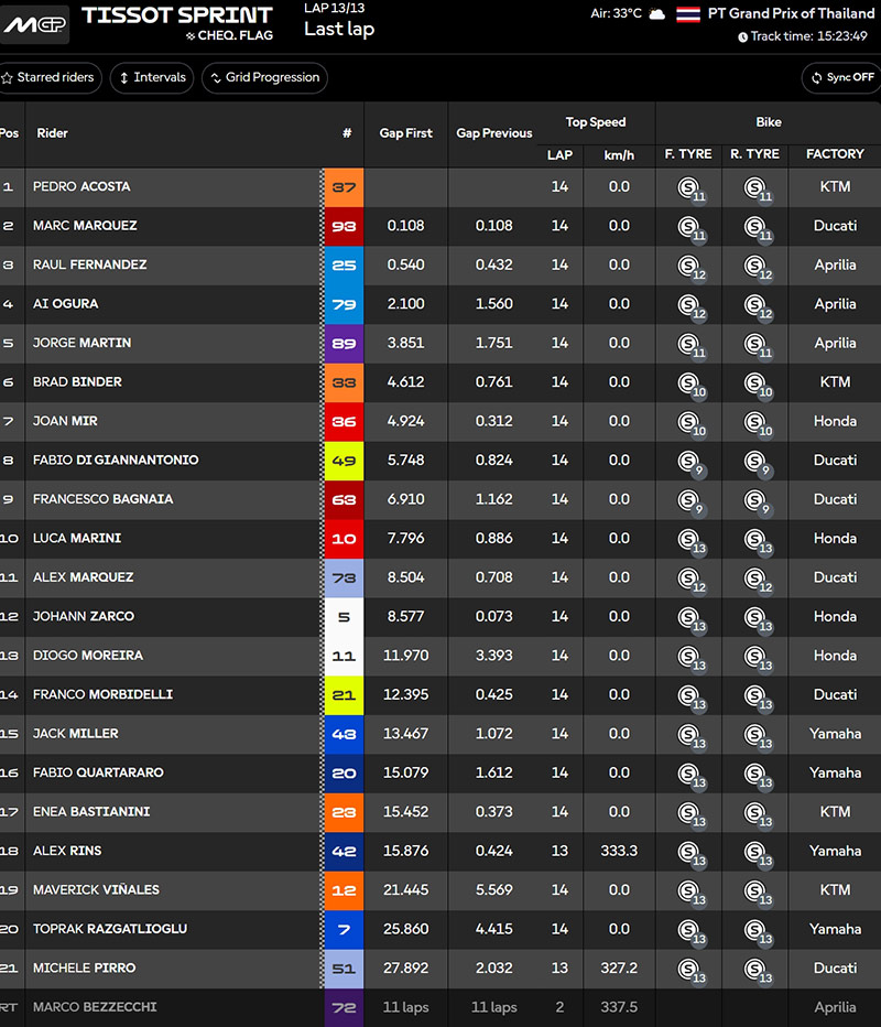 Résultats de la course sprint du Grand Prix de Thaïlande MotoGP 2026 :