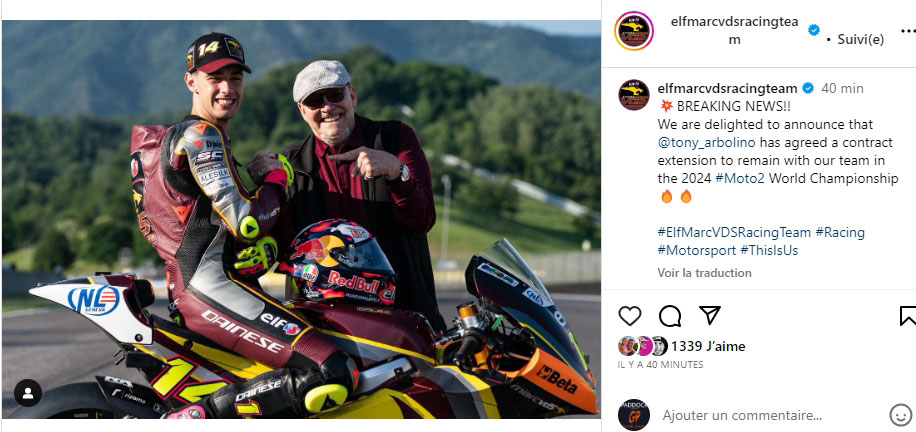 « Nous sommes enchantés d’annoncer que Tony Arbolino a donné son accord à une extensions de contrat pou rester avec notre équipe dans le championnat du monde Moto2 2024 »