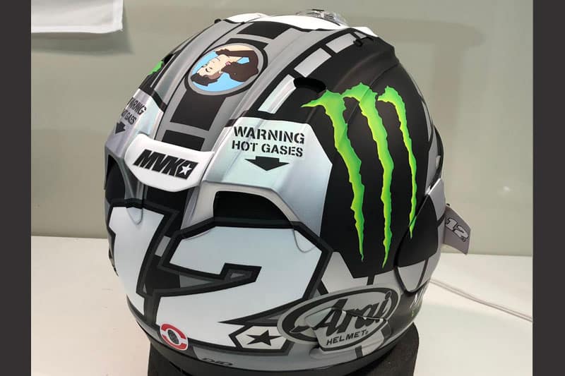Toujours dans le style revêtement métallique et avion de chasse, Maverick Viñales arborera cette saison un couvre-chef par ailleurs orné de son numéro 12.