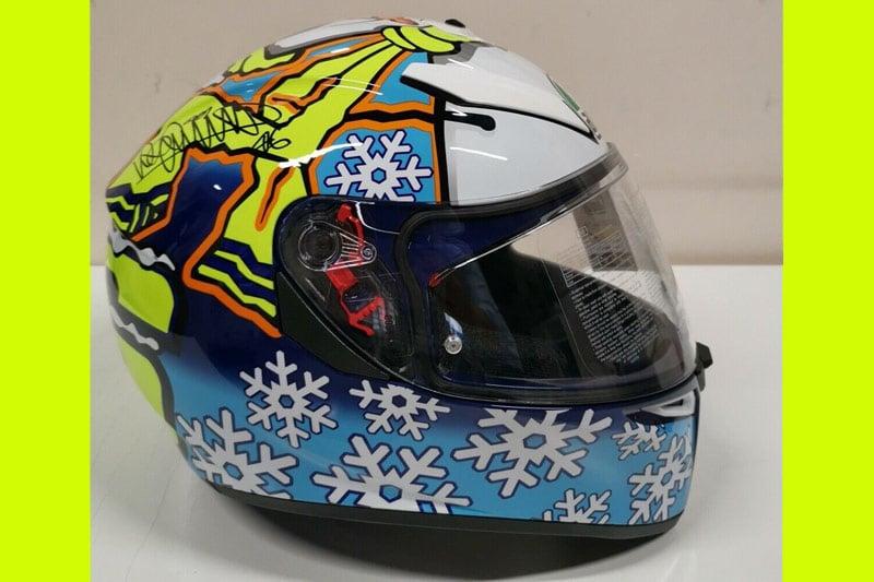 Pas tant que ça, puisque, d’après la photo, il ne s’agit que d’une réplique et non d’un « vrai » casque porté par le pilote Yamaha lui-même. Les fans italiens ne s’y sont pas trompés…