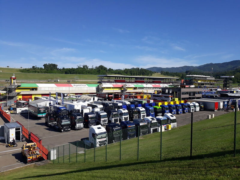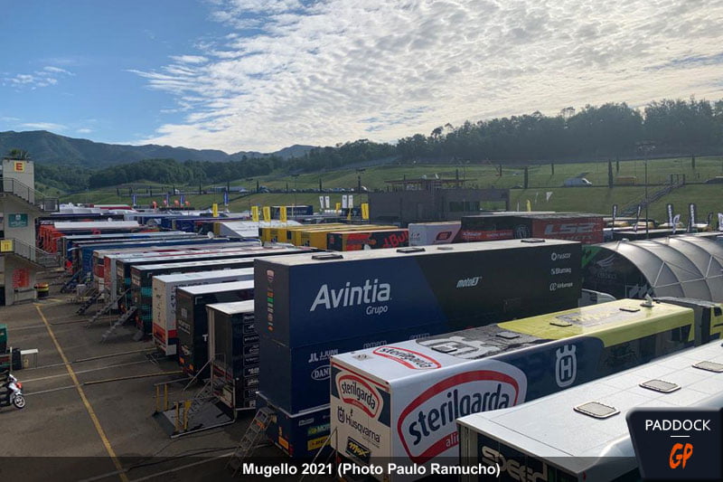 L’armée des rouges occupe également les box 3 et 4 avec Pramac Racing et Avintia, puis vient le deuxième constructeur transalpin, Aprilia, avec trois camions derrière le box 5.