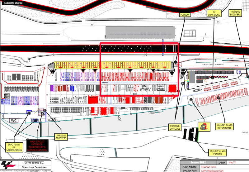 Le paddock contient beaucoup d’autres structures pour les Moto2, Moto3, fournisseur de casques et de combinaisons, motorhome pour les pilotes, structures pour les télévisions et les équipes techniques, etc.