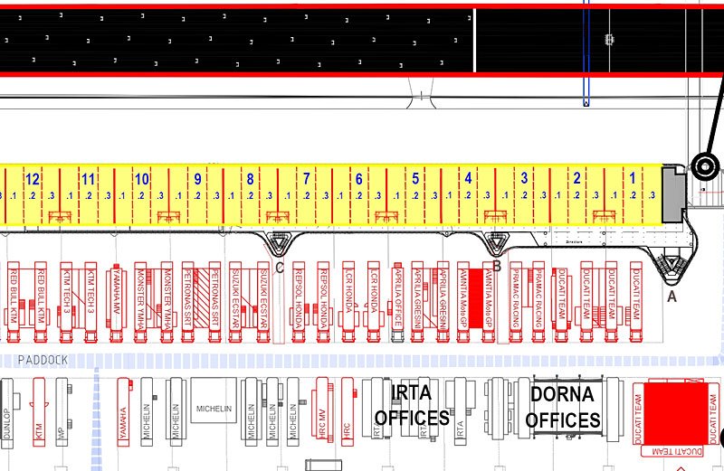 À noter que nous détaillons là uniquement la zone consacrée aux MotoGP, encadrées en rouge dans la photo suivante.