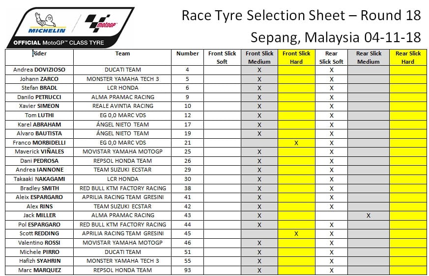 Michelin et le MotoGP ont dû faire face aux plus hautes températures de piste du week-end avant le départ de la course (20 tours), avec 53°C relevés sur l’asphalte. Quatre des six gommes proposées étaient présentes sur la grille de départ, avec une majorité de MICHELIN Power Slicks medium avant et de soft arrière. Face aux risques très élevés de pluies torrentielles, les organisateurs avaient dû avancer le départ de deux heures. L’épreuve s’étant déroulée sur le sec, le record de durée de course a été battu de plus de cinq secondes, tandis que les protagonistes ont poussé les pneus à leurs performances les plus extrêmes sous la canicule. Marquez s’est imposé – offrant le titre constructeur à Honda – après une superbe prestation. Le champion en titre avait signé le meilleur chrono en qualification pour décrocher la pole position sur une piste détrempée, des pluies diluviennes ayant perturbé le programme du samedi. Mais une pénalité l’avait fait reculer de six places sur la grille de départ et promu Johann Zarco (Monster Yamaha Tech 3) en pole. Au feu vert, c’est Valentino Rossi (Movistar Yamaha MotoGP) qui prit le meilleur envol et qui a mené la course pendant 17 tours. Mais avec Marquez revenu dans son sillage, Rossi a attaqué au maximum et chuté, laissant l’Espagnol filer vers la victoire.
