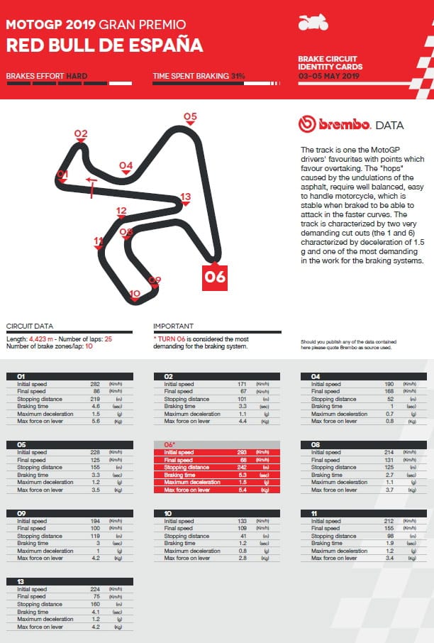 Cette année encore, 100% des motos participant au championnat MotoGP sont équipées de freins Brembo et les ingénieurs de Brembo ont attribué un indice de difficulté pour les freins à chaque circuit du calendrier : selon les ingénieurs Brembo qui assistent tous les pilotes MotoGP, le Circuito de Jerez est la piste la plus exigeante du premier tiers de la saison au niveau freinage, c’est-à-dire sur les 6 premiers Grands Prix. Sur une échelle de 1 à 5, il a obtenu un 4 sur l’indice de difficulté, le même score qu’Aragón et Brno.