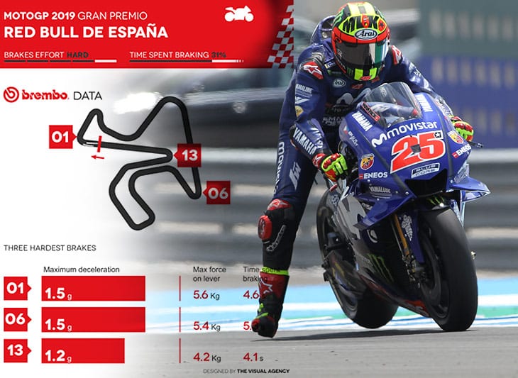 Cette année encore, 100% des motos participant au championnat MotoGP sont équipées de freins Brembo et les ingénieurs de Brembo ont attribué un indice de difficulté pour les freins à chaque circuit du calendrier : selon les ingénieurs Brembo qui assistent tous les pilotes MotoGP, le Circuito de Jerez est la piste la plus exigeante du premier tiers de la saison au niveau freinage, c’est-à-dire sur les 6 premiers Grands Prix. Sur une échelle de 1 à 5, il a obtenu un 4 sur l’indice de difficulté, le même score qu’Aragón et Brno.
