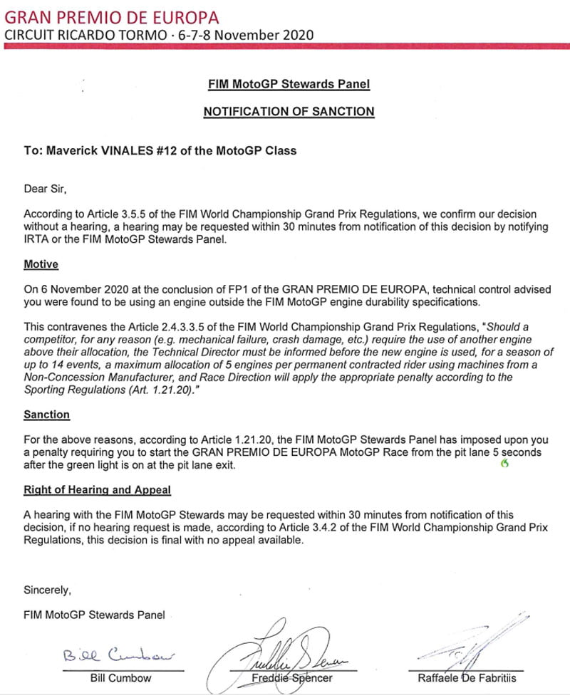 Victime collatérale de l’erreur de son employeur, Maverick Viñales sera contraint de s’élancer de la pit lane, et 5 secondes après tout le monde, au départ du Grand Prix d’Europe dimanche à 14 heures.