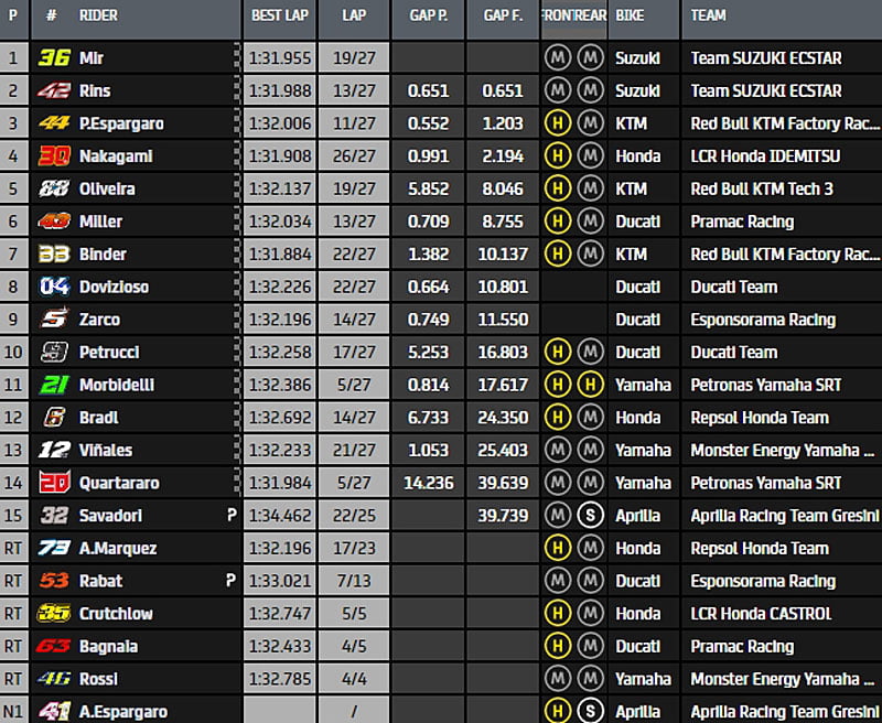 « Mais Miguel a réussi à se qualifier assez bien et il a fait un excellent départ. Il s’est retrouvé dans le top 4 pour la première partie de la course, juste derrière Pol Espargaró. À la moitié de la course, lorsque Nakagami l’a dépassé, il a simplement essayé de le suivre. Le cadre n’était pas idéal, mais il a simplement fait ce qu’il était censé faire. Il a baissé la tête, a gardé un bon rythme sans prendre trop de risques. Il a ramené la moto à la maison en cinquième position, ce qui équivaut à son deuxième meilleur résultat de la saison ».