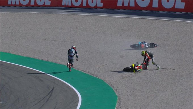 Fabio Quartararo abordait ce Grand Prix d’Europe à Valence avec le mors aux dents. La pluie était partie, la piste sèche, et le circuit qui lui a beaucoup apporté semblait ainsi lui donner le signe de sa rédemption. Un bon sentiment qui a fait long feu. Pris dans la mêlée du départ à cause d’une séance qualificative passable, il est parti à la faute dès le virage 4 au premier tour. Il n’a pas baissé les bras pour autant, rejoignant le combat. Mais sa Yamaha était blessée…