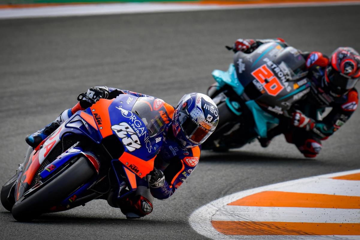Hervé Poncharal ne regrette décidément pas d’être passé chez KTM. Non seulement au regard des résultats récoltés, mais aussi au vu du bilan affiché par son ex-partenaire japonais… Après une première mi-temps à Valence placée sous le sceau du Grand Prix d’Europe, la seconde, éponyme cette fois, a aussi source de joie. Le Français explique : « la deuxième course à Valence est le deuxième grand résultat de Miguel Oliveira et de toute l’équipe Red Bull KTM Tech3. Les qualifications étaient moyennes, mais nous savions que nous avions le bon rythme et une fois de plus, Miguel a pris un excellent départ ».