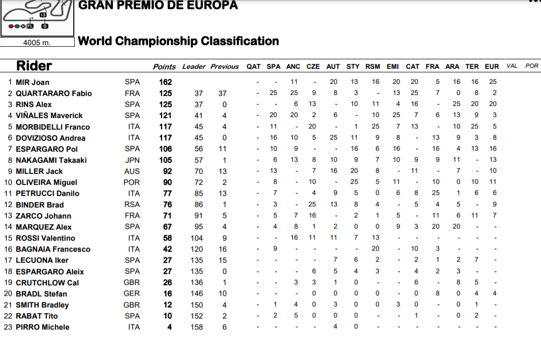 Championnat MotoGP avant le Grand Prix de Valence (13/14) :