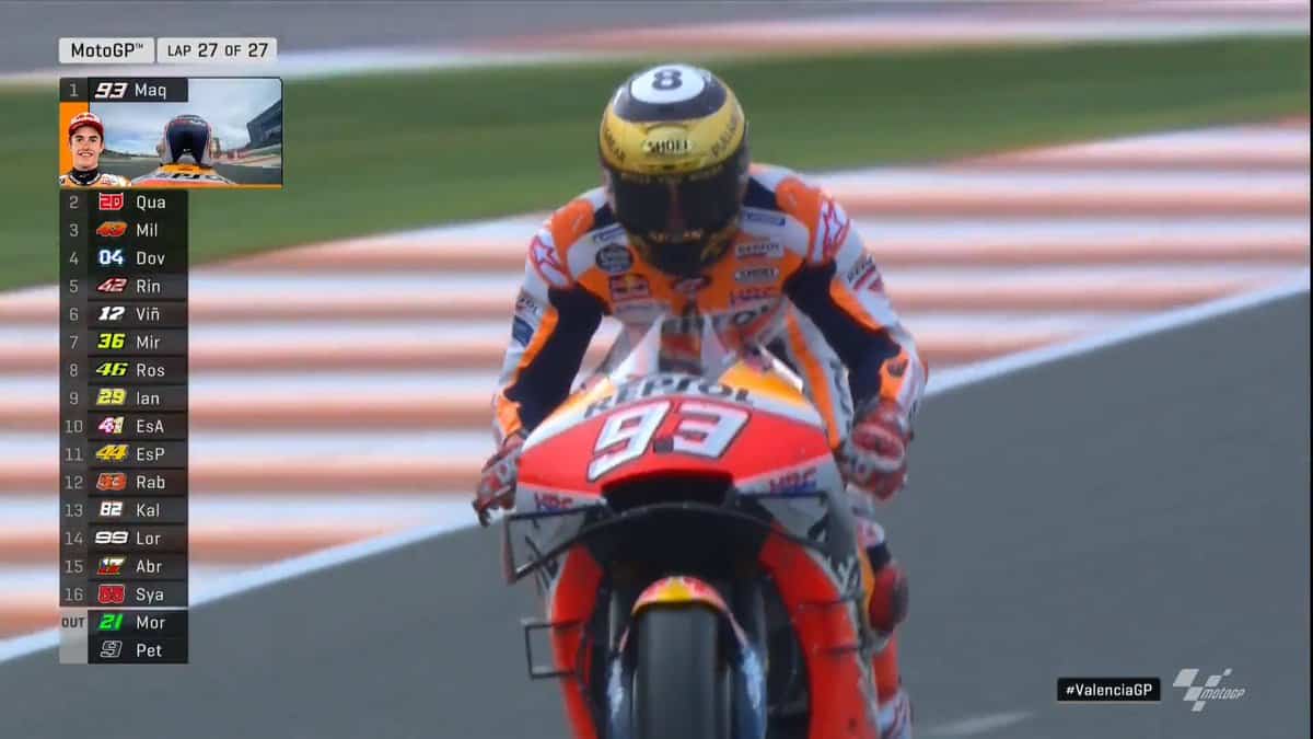 Sous le drapeau à damier, Marc Márquez rafle sa douzième victoire de la saison. Il passe la barre des 400 points et il est heureux de porter son équipe Repsol sur le toit du monde. Quartararo ne pouvait rien faire de plus avec une Yamaha qui n’a guère brillé dans cette course. Viñales, sixième est tout de même troisième du championnat, terminant derrière Rins qui n’a rien pu faire contre Dovizioso, l’officiel Ducati qui laisse le podium au pilote satellite Miller… Qui voit Quartararo le devancer dans le classement des pilotes indépendants.