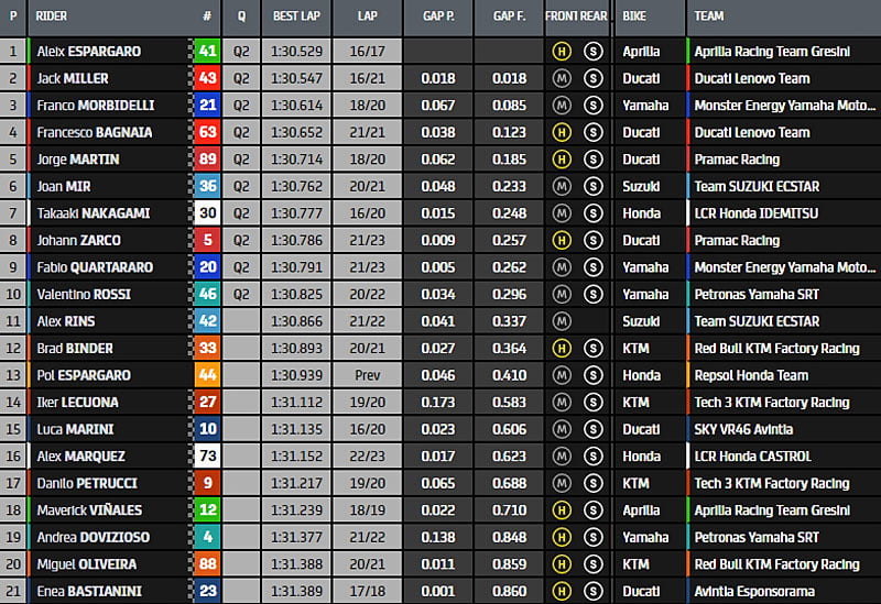 Pour l’heure, voici les dix pilotes provisoirement qualifiés pour la seconde partie des qualifications, en accord avec la hiérarchie des temps combinés établie hier : Jack Miller, Pol Espargaró, Pecco Bagnaia, Álex Rins, Jorge Martín, Takaaki Nakagami, Joan Mir, Brad Binder, Andrea Dovizioso et Johann Zarco.