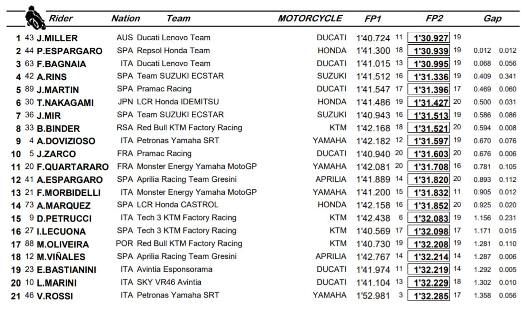 Résultats de la FP2 du Grand Prix MotoGP de la Communauté Valencienne :