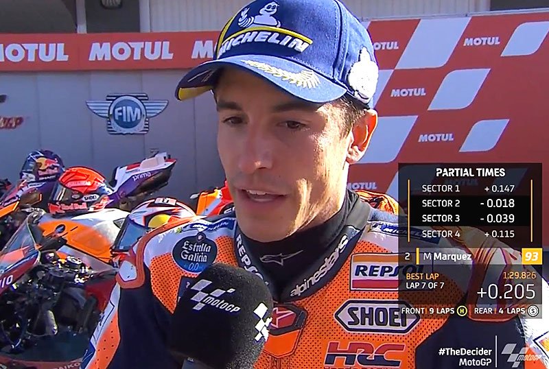 A peine descendu de sa Honda RC213V officielle après avoir obtenu la 2e position sur la grille de départ du Grand Prix de la Communauté vlencienne sur le circuit Ricardo Tormo, Marc Márquez s’est confié devant les caméras du site officiel MotoGP.com avec la satisfaction d’avoir arraché une place un peu inespérée et de pouvoir jouer le podium dimanche sur un circuit qu’il affectionne