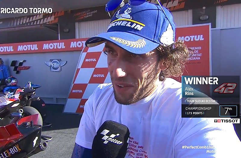 Álex Rins : « Fantastique, fantastique ! Alors qu’on termine la saison et que Suzuki s’en va, on ne pouvait pas mieux terminer ! P1 ! Je suis vraiment très fier et j’ai beaucoup appris avec Suzuki cette année. Je vais maintenant débuter un nouveau chapitre de ma vie, mais quoi qu’il en soit, merci les gars et merci à tous ceux qui nous ont soutenus. Je suis vraiment très heureux ! »