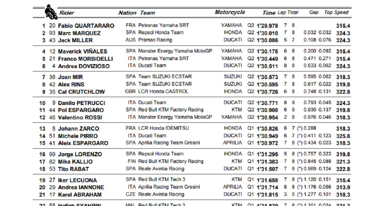 Miller signe un 1’30.086 auquel répond Quartararo en 1’30.007. Marc Marquez le colle à 3 millièmes, mais il lui reste encore un tour, comme à Fabio. Sous le drapeau à damier, c’est finalement Quartararo qui arrache le morceau en 1’29.978. C’est le seul pilote sous les 1’30. Márquez suit, Miller complète la première ligne.