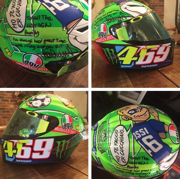 Le nonuple titré a donné son casque dédicacé du dernier Grand Prix d’Italie à la famille Hayden, en souvenir de Nicky disparu. C’est le frère Roger qui nous informe de cette démarche sur son réseau social. Sur le heaume, on peut lire cette phrase dédicacée : « à toute la famille Hayden. J’ai toujours eu de beaux moments tant avec Nicky qu’avec vous tous ». Un geste sincère d’un grand champion à la mémoire d’un autre.
