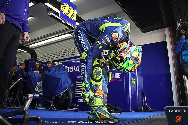 Après avoir longuement préparé ses protections auditives avant d’enfiler son casque, Valentino Rossi se lève de sa chaise, traverse son box et s’arrête un peu avant la ligne qui matérialise la pit-lane. Là, il s’immobilise avant de se plier en deux, la tête contre les genoux et les mains derrière les mollets.