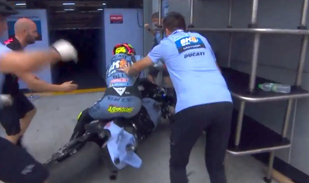 De retour dans le paddock, Aldeguer, moto roulante à la main, a perdu le contrôle de sa Ducati GP24. Résultat : glissade devant l’arrière du box Gresini, Michele Masini, le directeur d’équipe, presque percuté et un mécanicien… au bord de la crise cardiaque.
