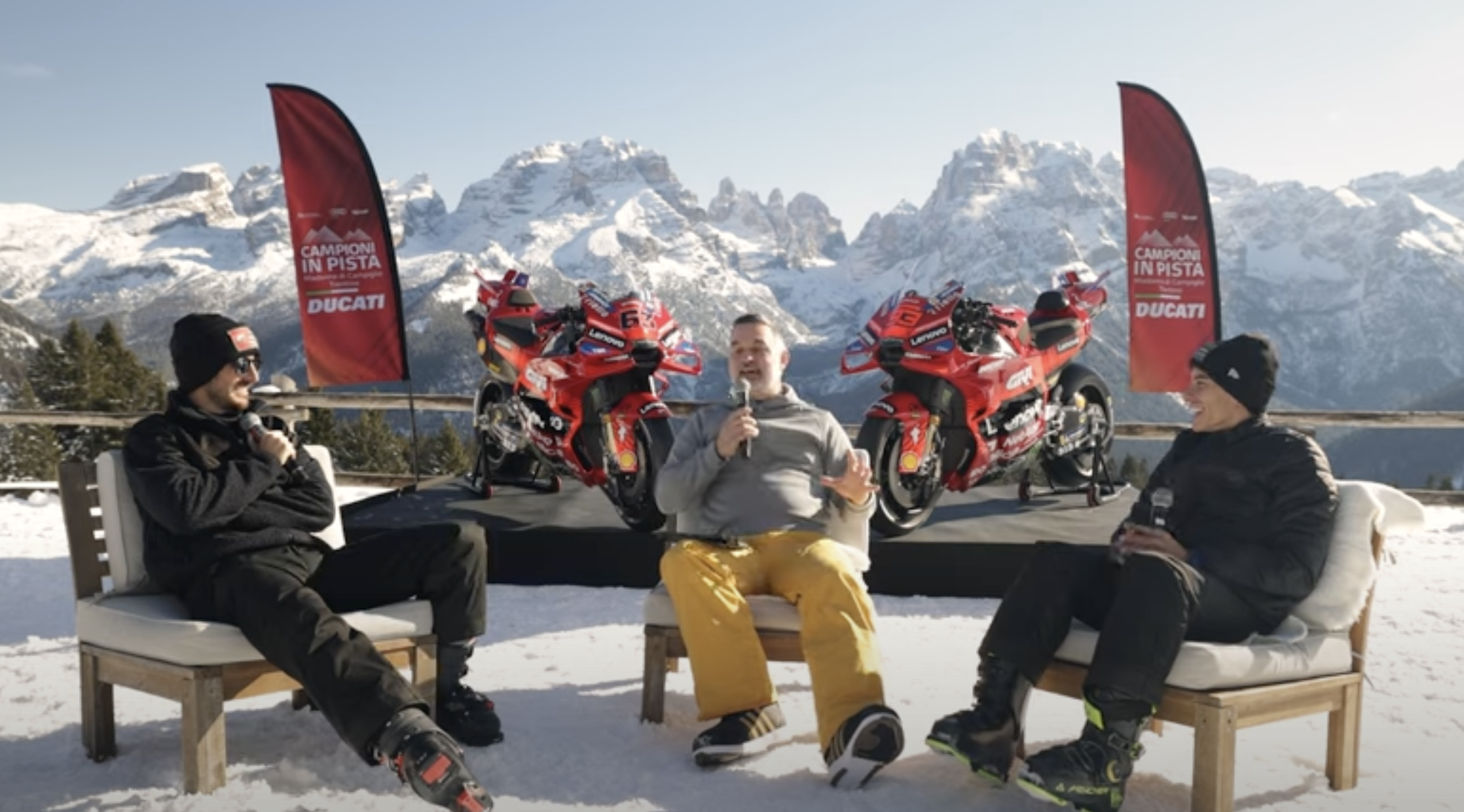 Lors du team building annuel de Ducati, Marc Marquez et Pecco Bagnaia ont pris le temps de se parler face à face, avant de débuter leur aventure ensemble dans l’équipe d’usine de Borgo Panigale. Une première interview officielle pour ce duo, présentée par Gavin Emmett, à Madonna di Campiglio, juste après une journée de ski.