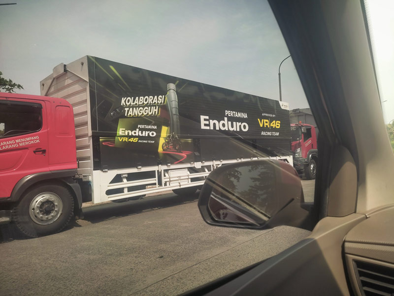 C’est là où nos amis indonésiens interviennent, en ayant aperçu dans les rues de Jakarta un camion posant question, puisqu’arborant ce que pourrait être la future livrée de l’équipe italienne. La photo, annoncée comme de @aldithedeztrom sur le réseau X (on n’a pas trouvé), présente une Ducati qui conserve sa couleur dominante noire ornée du jaune acide de qui vous savez, avec seulement l’inscription Pertamina (en petit) Enduro (en gros) en blanc.
