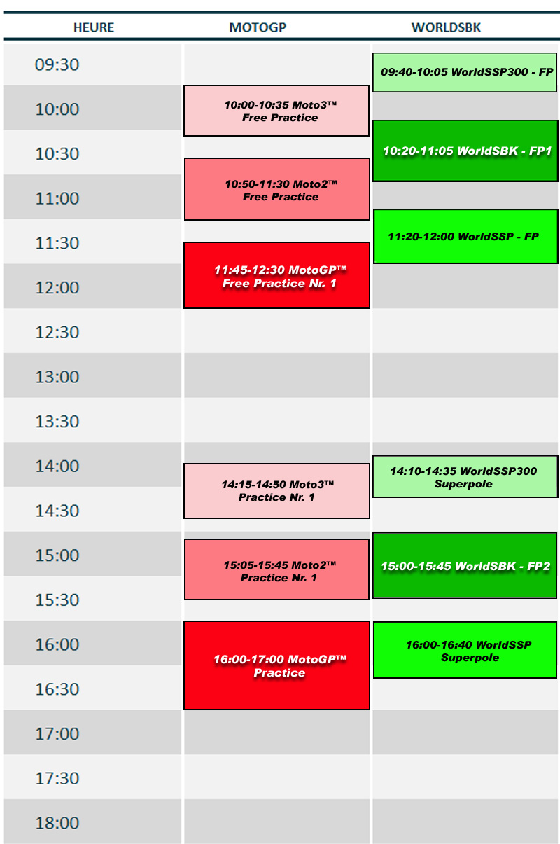 Entre le Grand Prix du Portugal à Portimao et la manche catalane du championnat du monde WorldSBK à Barcelone, les horaires du week-end s’annoncent chargés pour les passionnés de MotoGP et de Superbike.