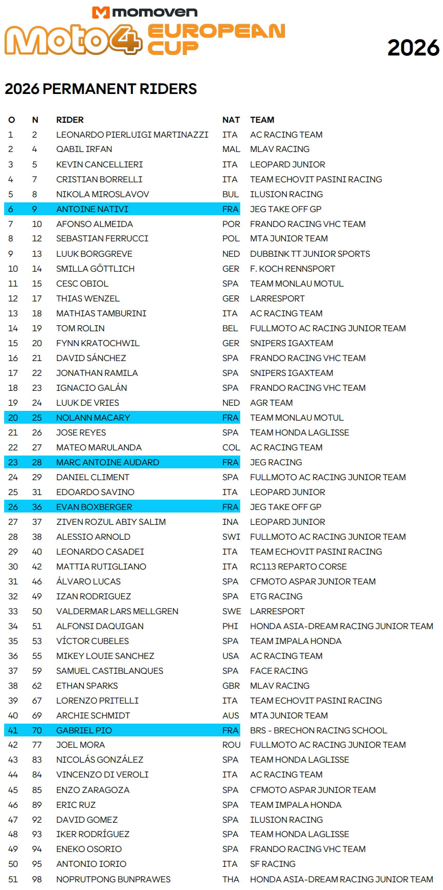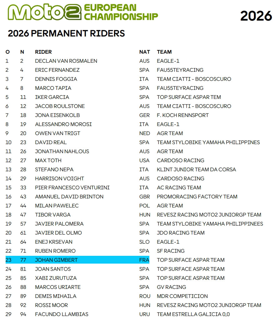 - Guillem Planque et Fabio Pilato, inscrits sur la liste précédente sous les couleurs Momoven Racing, ont disparu des inscrits, comme tous les pilotes de ce team…