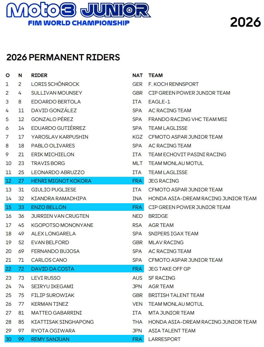 Alors que Fabio Quartararo et Johann Zarco continuent de défendre nos couleurs en MotoGP, la relève tricolore s’organise pour la saison 2026, et les listes des engagés permanents en MotoJunior révèlent une présence française solide et prometteuse, répartie sur toutes les catégories.