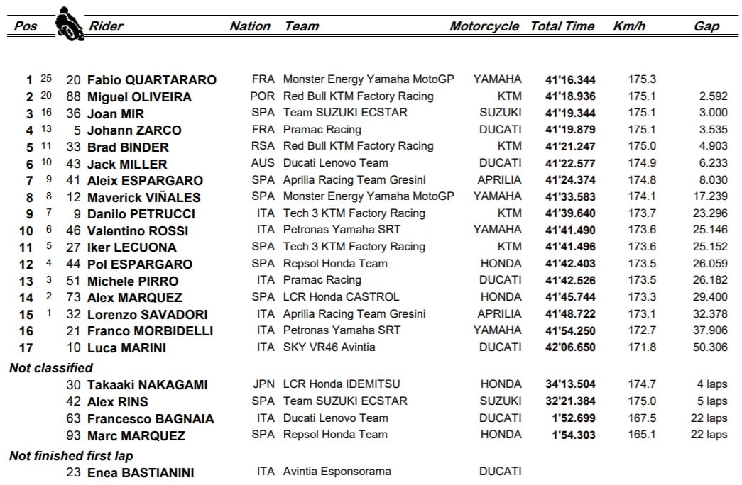 « Malheureusement la course s’est terminée plus tôt que ce à quoi nous nous attendions. C’est vraiment le pire scénario pour moi, car bien sûr comme chacun sait j’ai besoin de couvrir de nombreux tours et de parcourir de nombreux kilomètres sur la moto. C’est vrai que j’ai eu ce contact avec Brad Binder, et que c’est le genre d’accrochages qu’on voit souvent à cet endroit du circuit. C’est un incident de course. Je n’ai pas vu qu’il était encore à l’extérieur, et quand j’ai changé de direction on est entrés en contact et j’ai chuté. Fort heureusement j’ai été le seul à chuter, car c’était ma faute. »