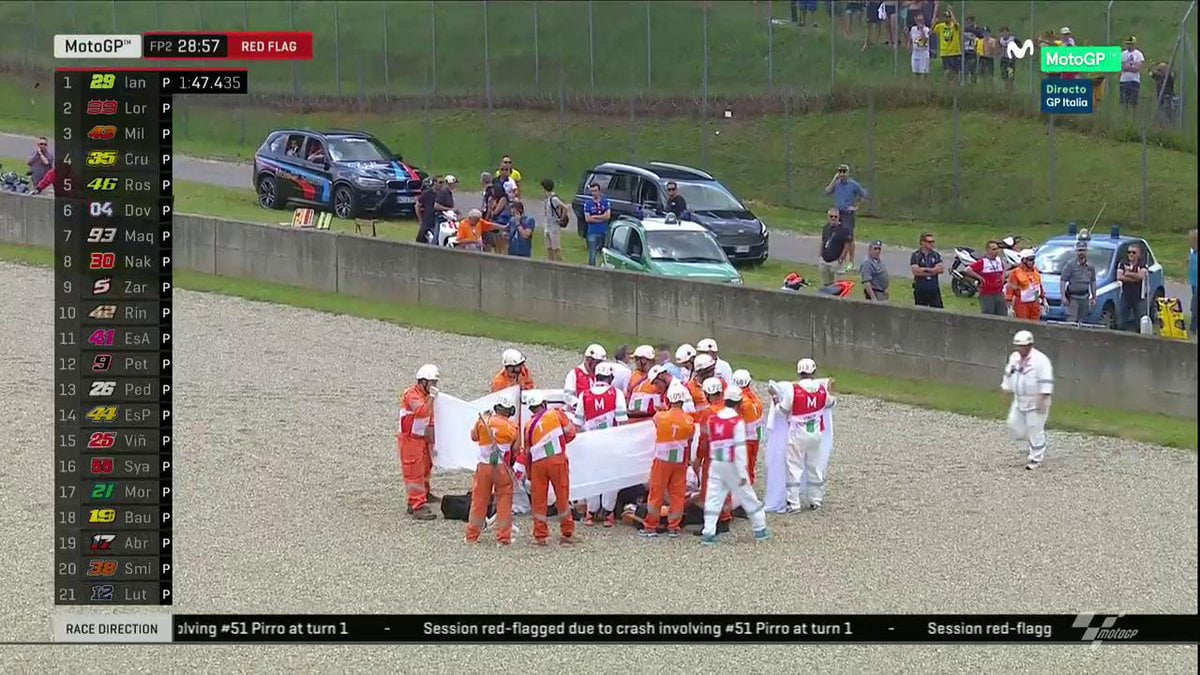 Le drapeau rouge était inévitable et a été demandé avec des gestes par Iannone, qui était juste derrière et a été témoin de l’accident. Secouru par le personnel médical, le pilote Ducati, d’abord inconscient, puis conscient, a été immobilisé et mis sous sédatif (souffrant de douleurs sévères) pour être transporté au Centre Médical.