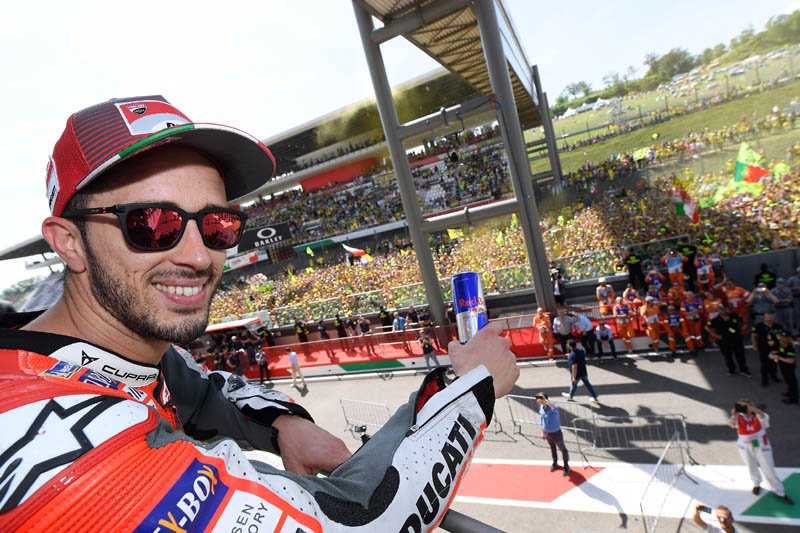 Andrea Dovizioso : « oui. Durant la course, j’ai perdu l’avant à de très nombreuses reprises. Sincèrement, quand vous perdez l’avant trop de fois, et après la chute de Marc, et après Le Mans (rires), vous pensez à beaucoup de choses durant une course aussi longue. J’ai essayé de rattraper Jorge mais j’étais plus lent que lui en entrée de virage et en milieu de courbe. J’ai essayé de changer de trajectoires mais personne n’avait vraiment d’adhérence à l’arrière et je ne pouvais pas réellement changer quelque chose d’assez important pour le rattraper. Je pense qu’il a fait une très bonne course car il a su gérer son avant médium et son arrière tendre d’une très bonne manière, et c’était très difficile. Je pense que nous avons pris une mauvaise décision concernant le pneu avant, car normalement je suis un des meilleurs pour préserver le pneu avant, grâce à mon style de pilotage et aux caractéristiques de la Ducati, mais nous n’avons pas voulu prendre de risques. En FP4, nous avons été relativement rapides avec le pneu dur, mais peut-être qu’avec la température élevée d’aujourd’hui le travail du pneu avant était pire. Peut-être. J’ai vu Valentino perdre beaucoup de fois le pneu avant et il avait le même pneu que moi. Ça, c’est le point négatif, mais nous devons aussi regarder les choses positives : 1er et 2e pour Ducati, c’est fantastique au Mugello. Et le championnat devient un peu meilleur. Revenir sur un podium au Mugello était un de mes objectifs pour le championnat. Globalement, je suis heureux car lors de mes 3 dernières courses, sur des pistes complètement différentes, nous ne nous sommes pas battus pour la victoire. Je pense que c’est ça la chose la plus importante ».