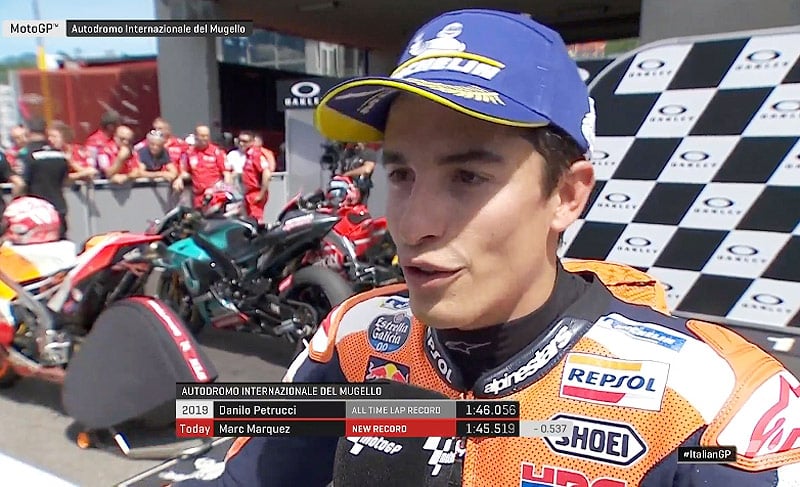 A peine descendu de sa Honda RC213V officielle après avoir obtenu la pole position lors de la qualification du Grand Prix d’Italie sur le circuit du Mugello, Marc Márquez s’est confié devant la caméra du site MotoGP.com.