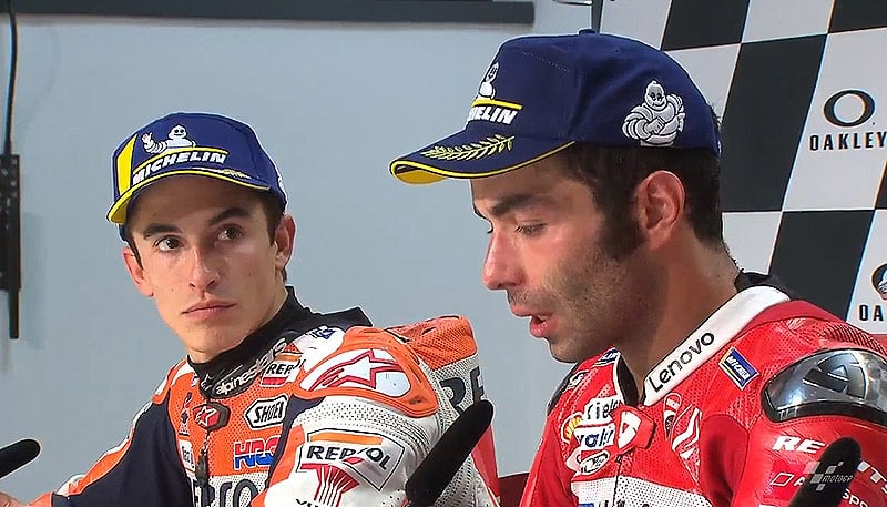 « Quoi qu’il en soit, comme on vous l’a dit depuis le début de saison, nous avons 2 objectifs différents. Le mien était de remporter ma première course, puis nous devons atteindre l’objectif d’Andrea et j’essaierai de faire tout mon possible pour atteindre cet objectif. Je suis vraiment désolé. Je pense que les deux, Marc et Andrea, auraient pu gagner aujourd’hui. Mais nous sommes toujours à la limite dans une compétition. Cette fois, c’était pour moi et je pense que j’avais une belle opportunité, mais la prochaine fois je pense que je penserai au championnat. Je pense que nous sommes le meilleur team en MotoGP, les points le disent, donc nous pouvons travailler ensemble pour être les meilleurs à la fin de l’année ».