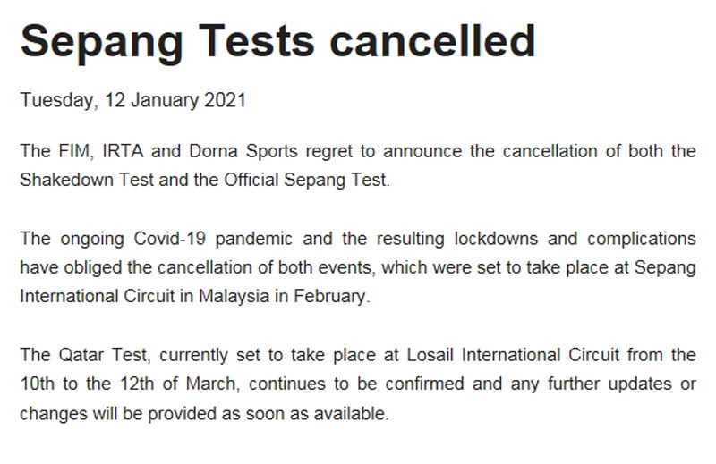 La FIM, l’IRTA et Dorna Sports ont le regret d’annoncer l’annulation du shakedown test et du test officiel de Sepang.