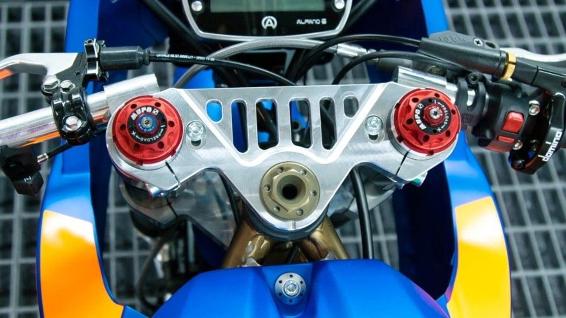 L’avant est équipé d’une fourche inversée de 33 mm avec une précharge réglable. Une mise à niveau est prévue avec une fourche de 38 mm réglable en précharge, compression et détente. A l’arrière, en revanche, il y a un bras oscillant en aluminium avec mono-amortisseur entièrement réglable : hydraulique en compression et en détente, précharge du ressort et même empattement.