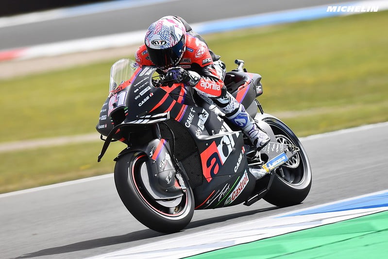 La stabilité de l’Aprilia lui permettait de profiter au maximum de l’effet « catapulte » que joue le virage n°17 (Ramshoek), à quelques encablures de la ligne. Ici, Aleix s’est littéralement joué, coup sur coup, de Johann Zarco dans la courbe tout en préparant le dépassement sur Joan Mir au freinage de la dernière chicane.