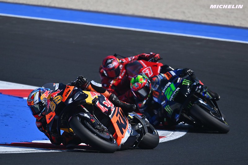 Brad Binder donne l’impression de se battre contre la RC16. Certains nous diront : « c’est son style de pilotage qui le veut ». Mais cet argument est réfutable. D’abord, c’est la première année qu’il est aussi offensif. En 2022, il réalisa une saison magnifique, marquée par une régularité dans la performance exemplaire. Ce n’est que depuis le début 2023 que l’on voit des attaques à outrance, des dépassement « PlayStation » pour reprendre le terme de Luca Marini à son égard. Cela signifie qu’il a fait évoluer son style en peu de temps. Mais n’est-ce pas la moto qui l’impose ? Dani Pedrosa a montré que la KTM pouvait se piloter autrement : même Brad Binder l’avouait, impressionné par le calme de l’Espagnol sur la machine.