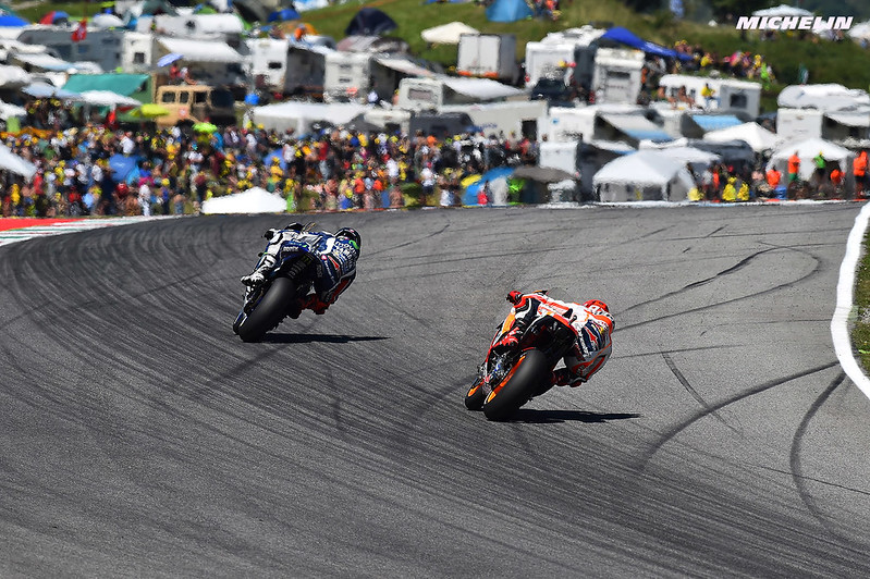 Commençons par là. Lorenzo, c’était avant tout un talent sans commune mesure. Son pilotage sans défauts lui permettait de réaliser des prouesses. Dans un bon jour, personne ne pouvait rien contre « Por fuera », et nombreux s’y sont cassés les dents. Grosso modo, son style consistait en une forme pure, sans à-coups, résultant en une vitesse de passage en courbe effarante. Les qualités du quatre cylindres en ligne crossplane Yamaha lui permettaient d’être inatteignable en virages. Jorge pouvait passer tous les tours au même endroit, et cela était particulièrement marquant depuis le bord de piste. Sa régularité est à étudier dans toutes les écoles de pilotage, toujours dans le même dixième de seconde sur plus de vingt boucles.