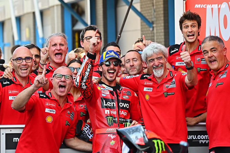 Nous sommes dans une année où le top 3 du classement équipes pourrait être constitué de trois formations Ducati. C’est hallucinant, tout simplement. On assiste à des manches, comme au Sachsenring, où les cinq premières machines sont toutes frappées du même emblème, avec huit Ducati dans le top 9. Un seul triplé est rarissime à l’échelle de l’histoire, alors un quintuplé est un accomplissement phénoménal.