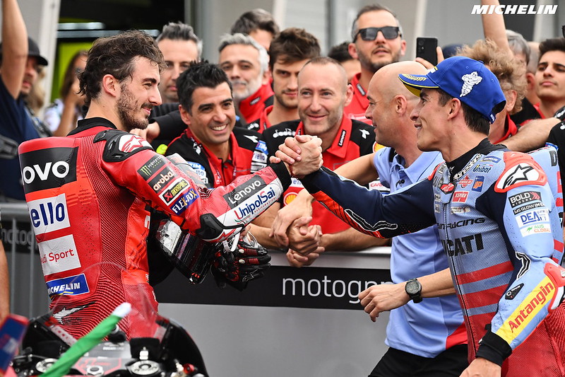 Ce millésime voit s’affronter deux philosophies similaires poussées à leur paroxysme. Assez loin devant Marc Marquez, Pecco Bagnaia et Jorge Martin foncent, sans se poser la moindre question. Si les styles diffèrent quelque peu, ils se ressemblent bien plus que ce que les médias laissent entendre. En effet, les deux hommes basent leur jeu sur leur vitesse intrinsèque, leur explosivité et leur panache. Ce sont deux attaquants qui ne craignent pas la chute, qui risquent tout à chaque sortie pour gagner, car ils ont compris que cette nouvelle ère nécessitait d’être devant, tout le temps. Peu importe qui sera titré, ils auront sans doute une moyenne de points assez faible en raison de leurs abandons, mais cela ne veut pas dire que leurs saisons respectives seront ternes.