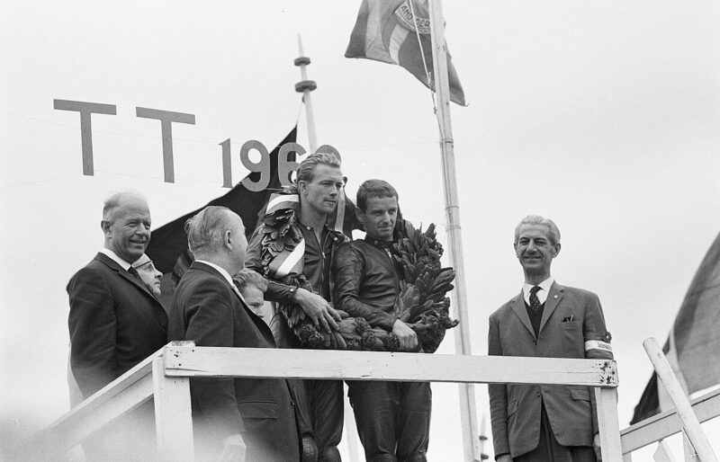 Ernst Degner (le petit, deuxième en partant de la droite) et Jan Huberts au TT Assen 1962. Photo : ANEFO