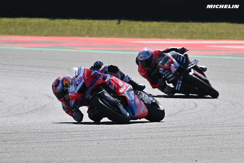Jorge affiche un rythme dantesque et ne commet que très peu d’erreurs. Mais aujourd’hui, Espargaró a la faveur du destin. L’officiel Aprilia enchaîne les tours rapides, et se montre de plus en plus menaçant. À Termas, les opportunités de dépassement sont maigres, tant il est nécessaire de garder de la vitesse dans les grandes courbes. Le virage n°5 est privilégié. Problème n°1 : il s’agit d’un énorme freinage réduisant la vitesse d’environ 270 km/h en quelques dizaines de mètres. Problème n°2 : Martín est l’un des meilleurs dans ce domaine.