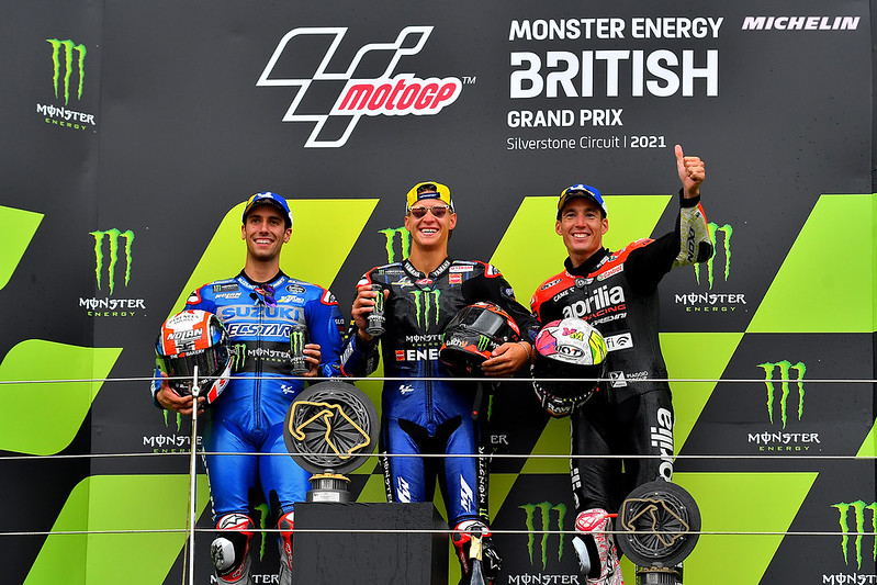 L’épreuve fut marquée par une méforme de Bagnaia, justement. Décidément, Silverstone ne lui porte guère chance ; l’Italien termina 14e. Devant, ça n’était pas des plus intéressant : Quartararo a triomphé pour un peu plus de 2,5 s sur un étonnant Alex Rins, qui décrochait là son seul podium de la saison. En troisième position, on retrouvait Aleix Espargaro, pour le tout premier top 3 d’une Aprilia sous l’ère que nous connaissons actuellement, quand l’équipe était encore associée à Gresini Racing. Avec du recul et en tenant compte du contexte de l’époque, c’était un trio plutôt original qui se présentait dans le parc fermé.