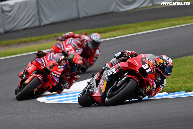 Premièrement, Pedro Acosta a pris la pole position. J’ai l’impression que cette information – arrivée très tôt à nos oreilles en raison du décalage horaire – est un peu passée innaperçue, mais c’est une véritable marque de progression. C’était sa première en MotoGP, et la première d’un rookie depuis Marco Bezzecchi au Grand Prix de Thaïlande 2022. Il devient le troisième plus jeune poleman, et c’est non négligeable. Certes, elle était quelque peu circonstancielle, car des favoris ont fait des erreurs (Pecco Bagnaia et Jorge Martin), sans même parler de l’annulation du tour de Marc Marquez. Mais tout de même, il fallait aller la chercher. Rien que cette prouesse place son GP du Japon au-dessus de beaucoup d’autres cette année, vous en conviendrez.