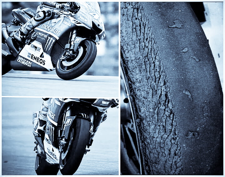 Si on regarde attentivement, en 2013, Marquez gagne, suivi de Pedrosa (pilote léger = moins de contrainte sur le boudin), suivi de Lorenzo (pas un freineur puissant mais adepte de l’entrée en courbe rapide ), suivi de Crutchlow (dont le freinage est puissant mais très bref).