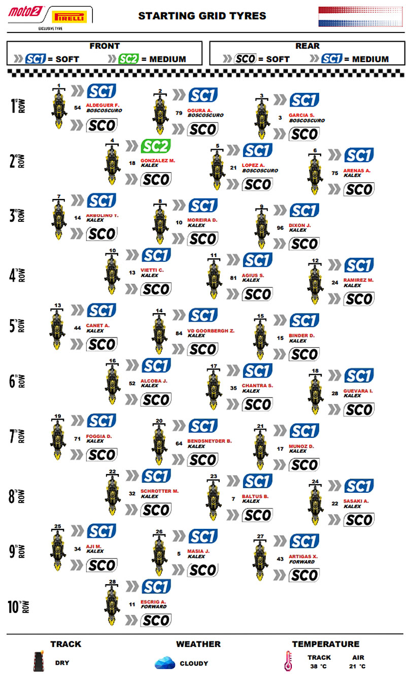– Les choix ont été pratiquement unanimes en termes de composés pour la course. Presque tous les pilotes ont utilisé les solutions tendres, donc le SC0 à l’arrière et le SC1 à l’avant, à la seule exception de Manuel Gonzalez (QJMOTOR Gresini Moto2/Kalex) qui a opté pour le SC2 médium à l’avant.