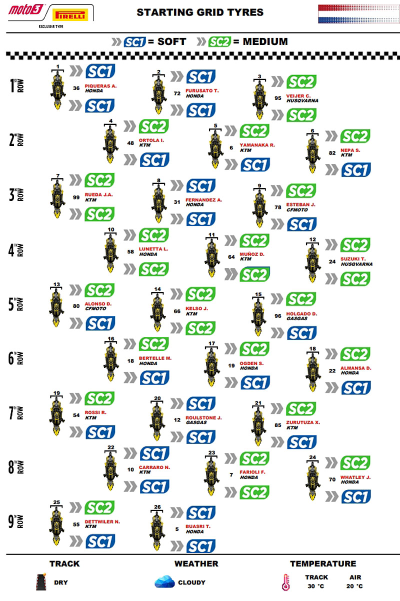 – En course, presque tous les pilotes (20 sur 26) ont opté pour le pneu SC2 médium à l’avant, le plus adapté aux caractéristiques de la piste néerlandaise, avec deux exceptions significatives : Piqueras, auteur de la pole position, et le pilote en deuxième position sur la grille, Furusato, ont opté pour le SC1 tendre. En revanche, à l’arrière, le SC1 souple était la solution la plus populaire (19 pilotes sur 26), mais certains, comme Veijer, préféraient le SC2 médium (6 pilotes sur 26).