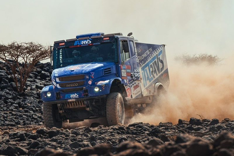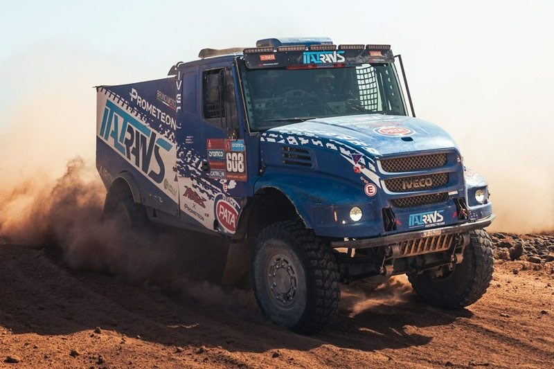 Cap au Nord-Ouest pour l’étape du mardi reliant Bisha à Al Henakiyah, qui comprenait 466 kilomètres de liaison encadrant une spéciale de 327 kilomètres, dont la première partie était très rocailleuse avant de prendre de la vitesse sur des plateaux sablonneux sur environ 200 kilomètres. Là, les plus de 1050 chevaux et les 5000 Nm de couple du moteur Iveco de 13 litres de cylindrée ont pu faire parler la poudre, et c’est en 9e position que le camion Italtrans a franchi la ligne d’arrivée, en concédant 32 minutes au vainqueur du jour.