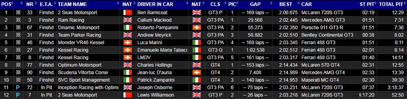 Pour le moment, la McLaren 720S #33 du team 2 Seas Motorsport semble avoir un rythme inatteignable en tête de la course malgré un leadership provisoire de la Porsche #67, mais son parcours n’a pas été sans péripéties, tout comme cela a été le cas pour la deuxième voiture de cette équipe, cette dernière n’accomplissant que 26 tours suite à un problème de turbo.